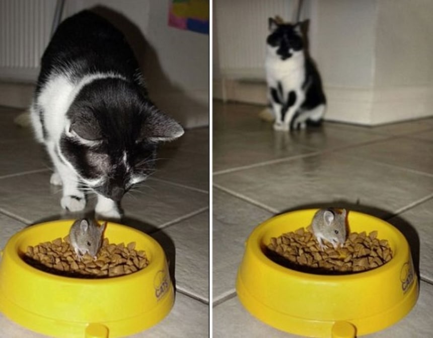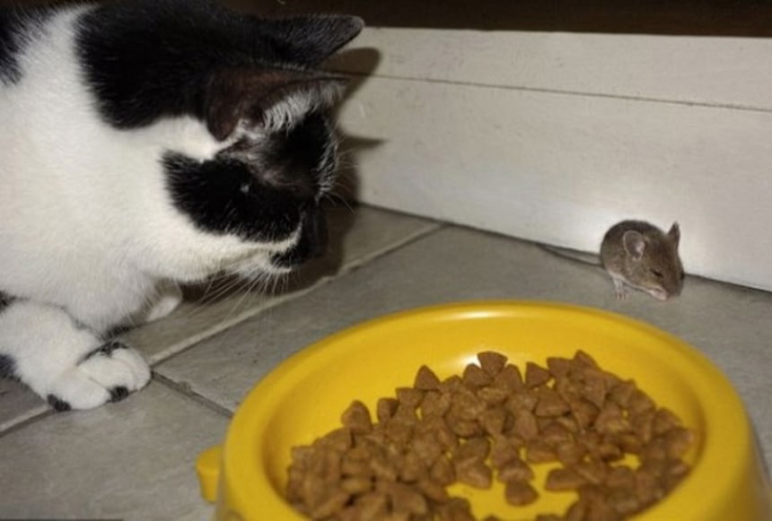 この画像を大きなサイズで見る猫は動物の中でも個性豊かというか個体によって性格がまるで異なる。アグレッシブな猫もいれば、臆病な猫もいて、みんな違ってみんないいのだが、中にはネズミを怖がる個体もいるようで、ちょっとビビリなところのあるオス猫のマンゴーは、自分のエサを小さなネズミに盗み食いされ放題。