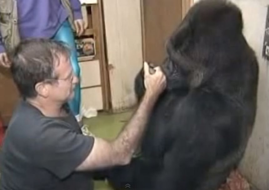 この画像を大きなサイズで見るこの男性はアメリカの俳優、ロビン・ウィリアムズさん。彼は数年前、人生で最高の時間をゴリラのココから与えてもらったという。ココは、手話で人間とコミュニケーションをとることができるゴリラのメス。既に1000語以上の手話を習得しているという。