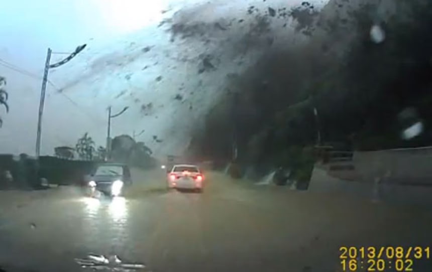 台湾北部基隆市で突如発生した土石流。この日は雨で地盤もゆるくなっていた為か、崖崩れが起き、巨大な岩がコロコロと・・・そこを走っていた白い一台の車がもろにこのあおりを食らった。危機一髪の瞬間だが、無事難を逃れることができたようだ。