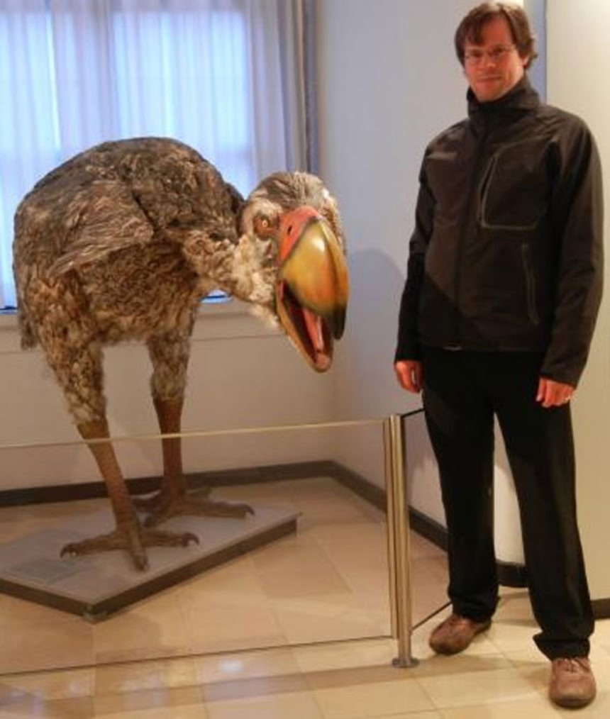 この画像を大きなサイズで見るその為、この鳥は獰猛な肉食動物だろうという説が一般的であった。巨大な頭部と鉤型のくちばし、強い力のある脚などは明らかに肉食のもので、鉤型のクチバシを使って獲物の首を引きちぎっていたと考えられていた。