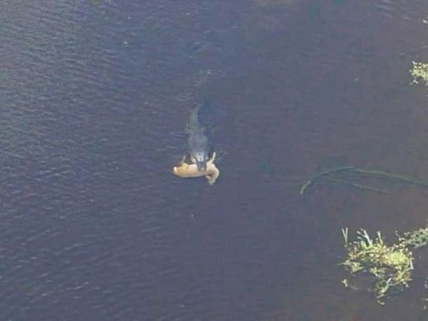 この画像を大きなサイズで見る2004年、ルイジアナ州のクロス湖でシカの遺骸を口にくわえて泳ぐワニ。この写真に湖岸でのんびりしていた釣り人たちはパニックになった。実際は、この写真はジョージア州南部で撮られたという。