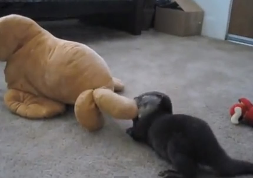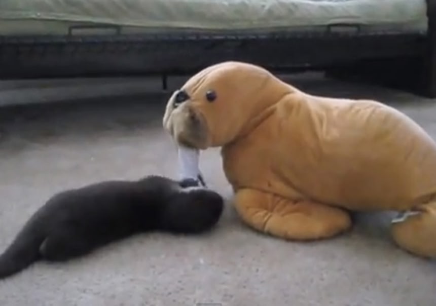 対決!カワウソの子ども vs セイウチのぬいぐるみ