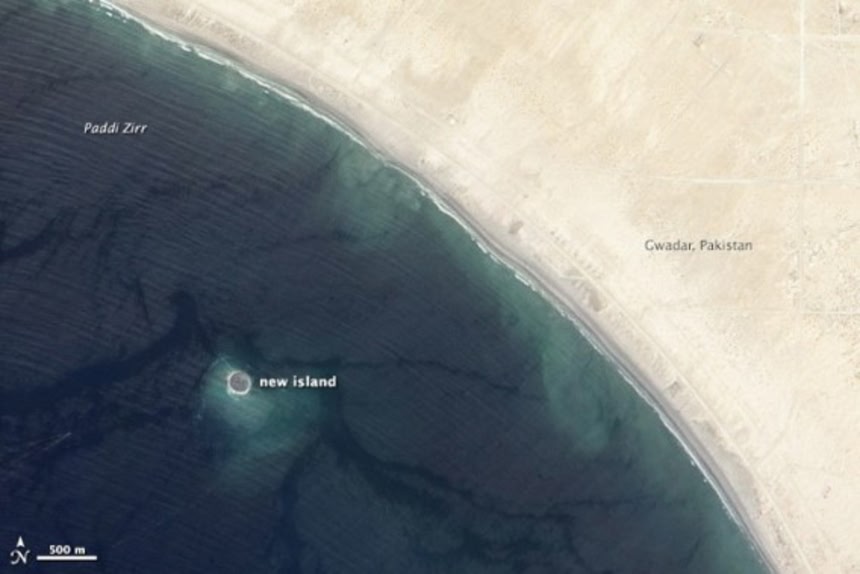 この画像を大きなサイズで見るパキスタンで、9月24日、マグニチュード7.7の大規模地震が発生した。死者は500人以上と深刻な被害をだしたが、同国沖合のアラビア海に新たな島が出現し、地元住民からは驚きの声があがっている。上記写真はNASAが上空から撮影したものだ。