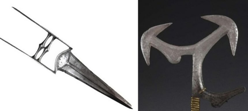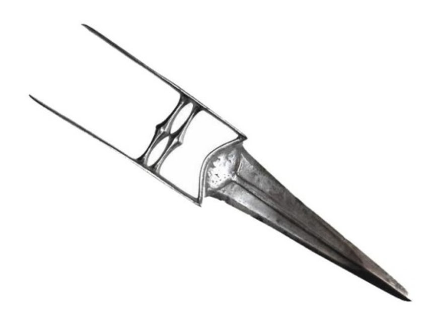 この画像を大きなサイズで見るユニークな形のインドの短剣。H型の刃に水平な握りは、ナックルダスター(メリケンサック)のようだ。パンチをくらわせたり、突いたりして、鎖帷子に穴があくほどの威力がある。クピンガ同様、シク教徒のステイタスシンボルで、儀式で使われることもある。 カタールとよく間違われるそうだ。