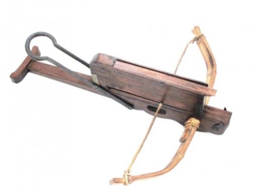 この画像を大きなサイズで見る中国の連発式クロスボウ。4世紀にさかのぼる武器。射程は60メートル、15秒間に10本もの石矢を放つことができる。現在の単発式クロスボウと比べると、貫通力は弱いが、スピードがあり、矢に毒を塗ると効果的。1894年から1895年の日清戦争まで使われていた。