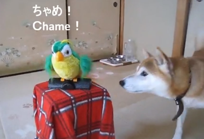 ここのお宅には柴犬のまめさんとちゃめさんがいる。飼い主の声で話すおもちゃのインコを投入したところ、ちゃめさんの方はあっさりとインコの命令に服従してしまったそうだ。