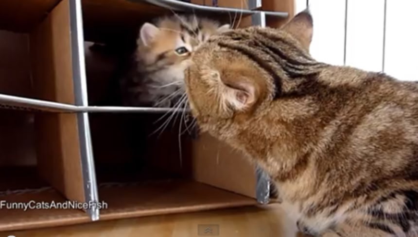 巣箱に入った子猫を見守る母猫はまるで鳥の巣の親子のようだ。
