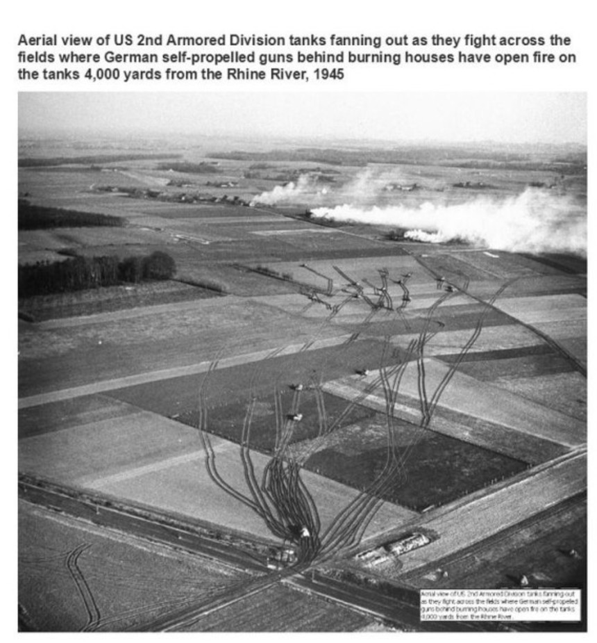 この画像を大きなサイズで見るライン川から4,000ヤード(約1.2km)付近にいたアメリカ軍第2機甲師団の戦車達が、畑の向こう川、燃える家屋の背後にいたドイツ軍の自走砲からの砲撃にギョッとして散開する様子を上空から撮った写真。
