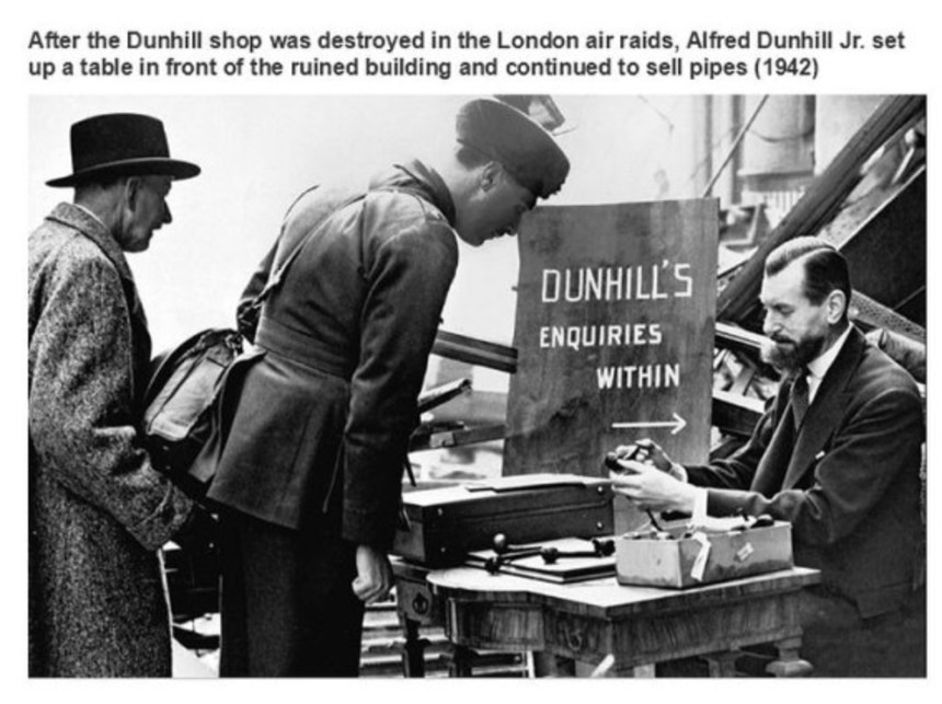 この画像を大きなサイズで見るダンヒルの店はロンドンが空爆を受けた際に破壊された。その後アルフレッド・ダンヒルJr.は崩れたビルの前にテーブルを設置し、パイプを売りを続けた