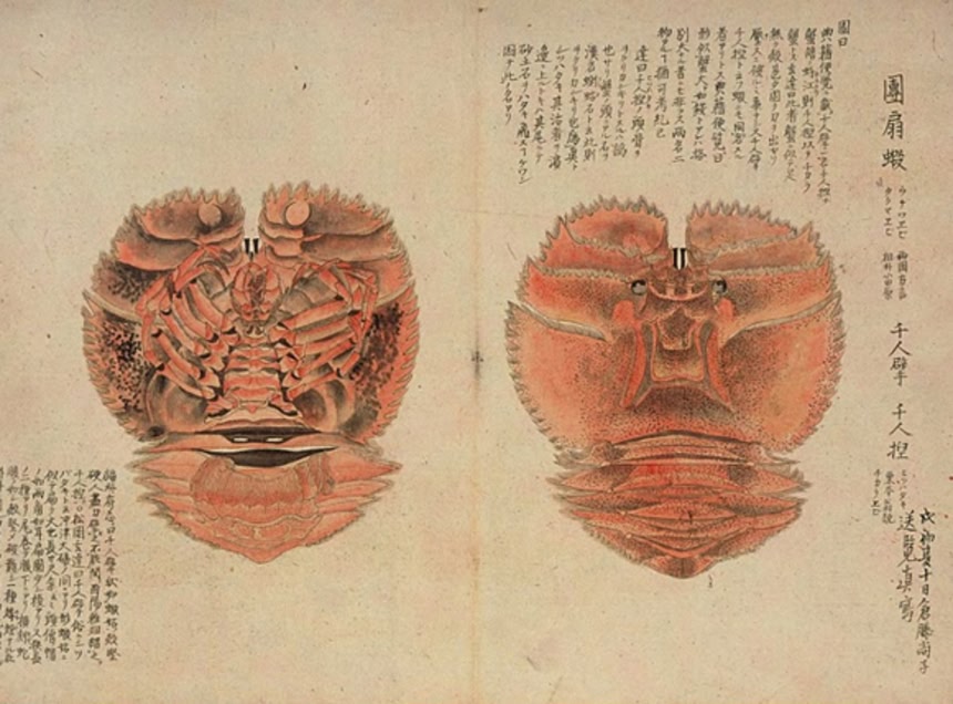 これらの絵は、海の生き物を描いた『梅園介譜』からのものだ。カブトガニ、エビ、カニ、カメ、貝など。というか江戸時代にはカブトガニがどこにでもいたんだね。