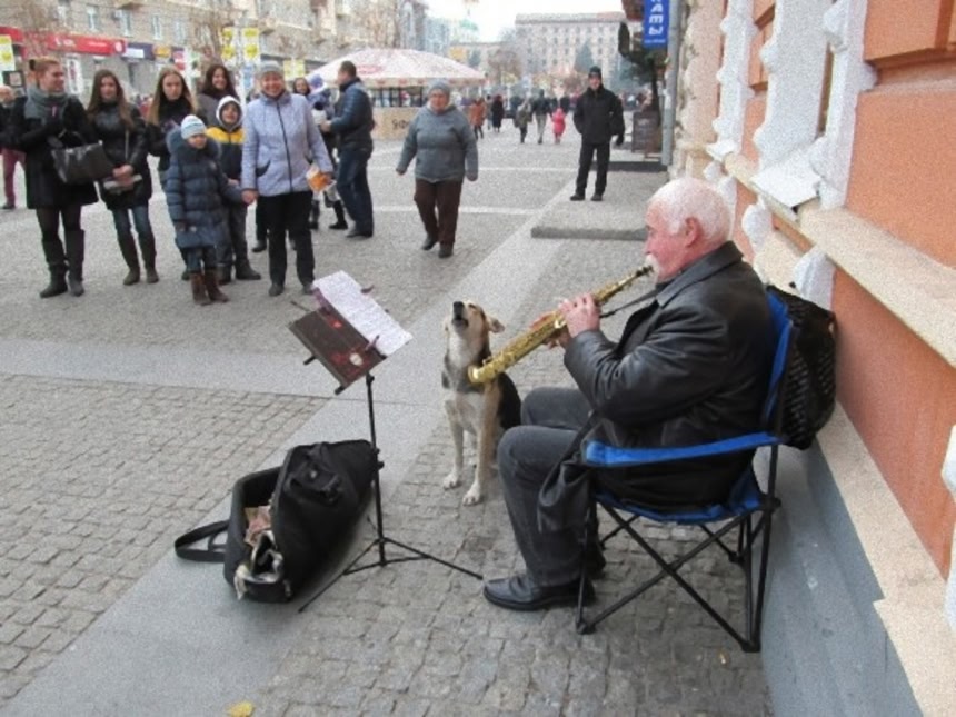 ウクライナの都市、ドニプロペトロウシクで、おじいさんが奏でるクラリネット、じゃなくソプラノサックスに合わせて熱心に歌っている1匹の犬。このおじいさんはこの通りでずっとストリートミュージシャンとして演奏していたが、ある日野良犬がやってきて、ちょこんとおじいさんの横に座り、演奏と共に鳴き声を出しながら、歌を歌って帰って行ったという。