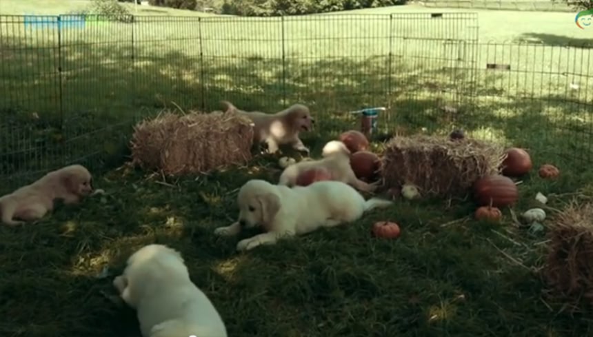 ゴールデン・レトリバーの子どもたちが、生まれてから初めての秋を迎えた。かぼちゃに戯れながら、芝生の上をピョンピョン駆け抜ける子犬たちはまるで羊の群れのよう。見ているだけで心に陽だまりが生まれてくるよ。