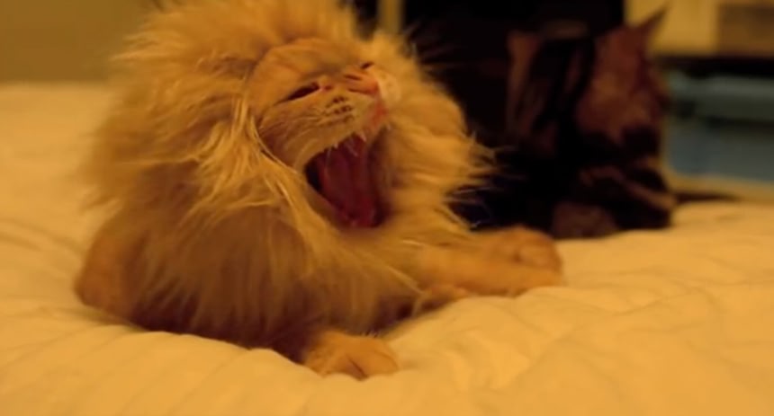 茶色いトラ模様の猫の頭に茶色のフェイクファーを装着したら、あらやだライオンそっくりに。でもってその猫ライオンのけだるい動作がまさしくお腹がいっぱいな時のライオンみたいだったようだ。
