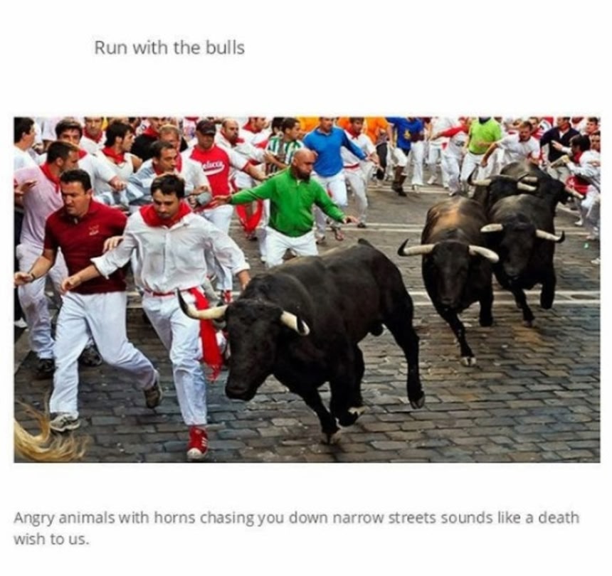 この画像を大きなサイズで見る鋭い角をもつ怒った牛に狭い通りを追いかけられたら、確実に死はすぐそこにある。