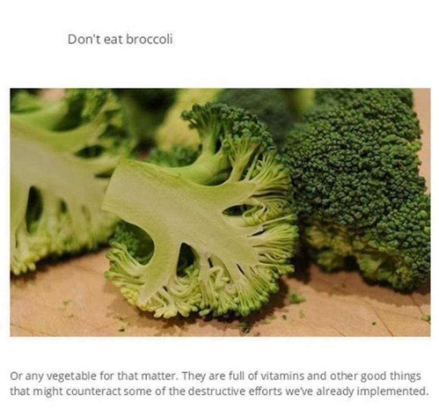 この画像を大きなサイズで見るブロッコリーに限らず、どんな野菜も手を出さないほうがいいだろう。野菜にはビタミンやその他体に良いものがたくさんつまっているため、死のうとしているこれまでの努力が水の泡になってしまうかもしれないから。
