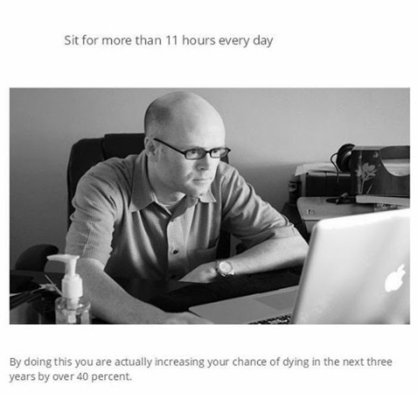この画像を大きなサイズで見るこうやって、ずっと座りっぱなしでパソコンを見ているだけで、3年以内に40%以上の確率で死ぬ可能性が増すと言われている。