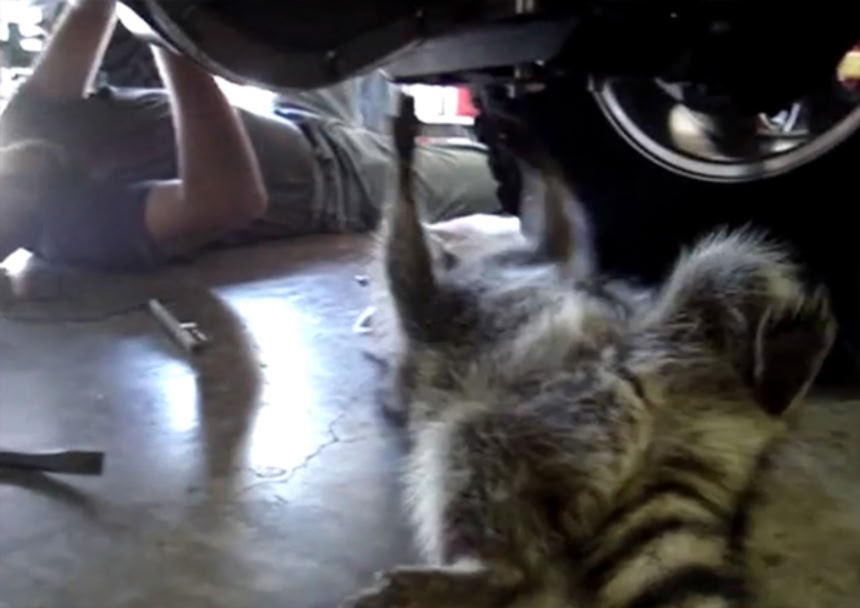 自動車を修理中の飼い主が見てられなくなかったらしく、そのお手伝いをするメカニックなアライグマ。お手伝いどころか主導権はアライグマにあるようだ。一級整備士の資格くらいもってそうだ。