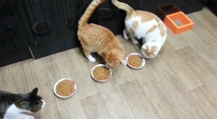 白と茶色のブチ猫が餌を食べようとすると頭からズコっとつっこんで阻止。しょうがないから他のお皿の餌を食べようとするも、それも阻止。とにかく片っ端からブロックしまくっている。