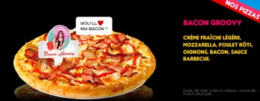 この画像を大きなサイズで見るランスのドミノピザにはアメリカより凝ったメニューがある。具材はサワークリーム、モッツァレラチーズ、ローストチキン、オニオン、バーベキューソース、そしてベーコン。ネーミングもなんだかお洒落な感じだ。