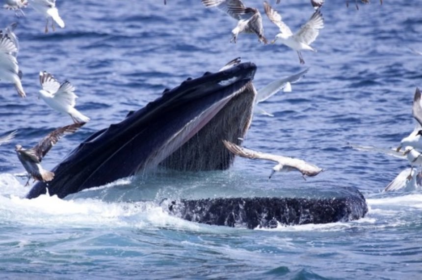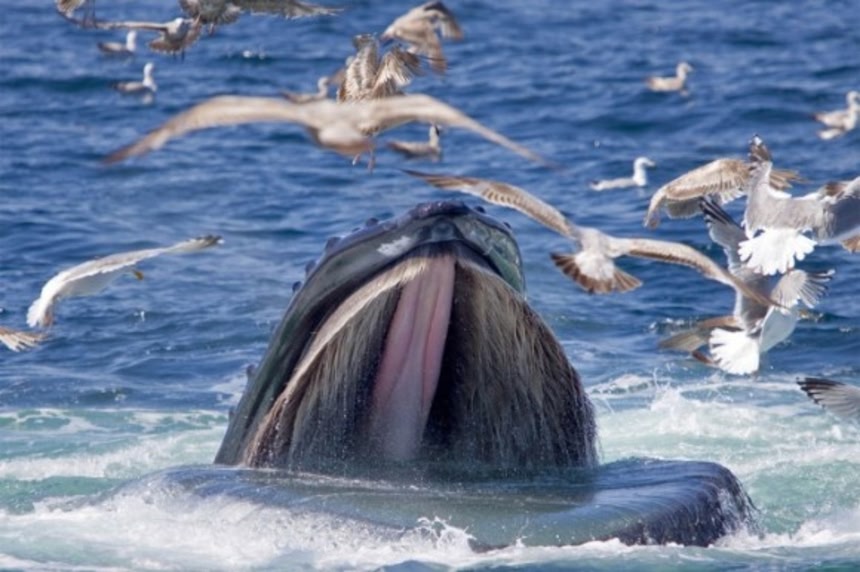 巨大なクジラが大きく口を開けても、まったく動じないカモメたち。