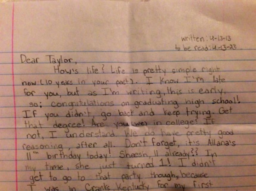 この画像を大きなサイズで見るティムによると、テイラーちゃんはとっぴなこと、有意義なことをするのが好きで、いつもなにか話のネタを作り出していた。未来の自分に宛ててこんな内容の手紙を書いたのもちっとも驚くようなことではなく、まさにこれが彼女そのものなのだという。