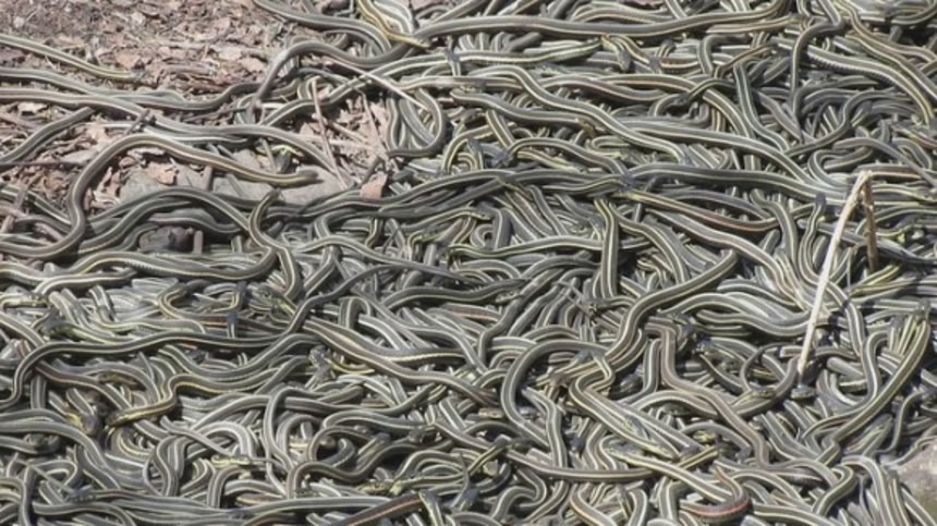 ここは、ナミヘビの一種、レッドサイデッド・ガータースネークの世界最大の巣穴と言われており、冬の間、彼らはここの石灰岩の洞窟で冬眠する。4月末から5月はじめ、雪が溶けると何千と言うヘビたちが目覚めて穴から外へ這い出し、交尾を始める。おびただしい数のヘビが折り重なって絡まっている光景はなんとも不気味だ。