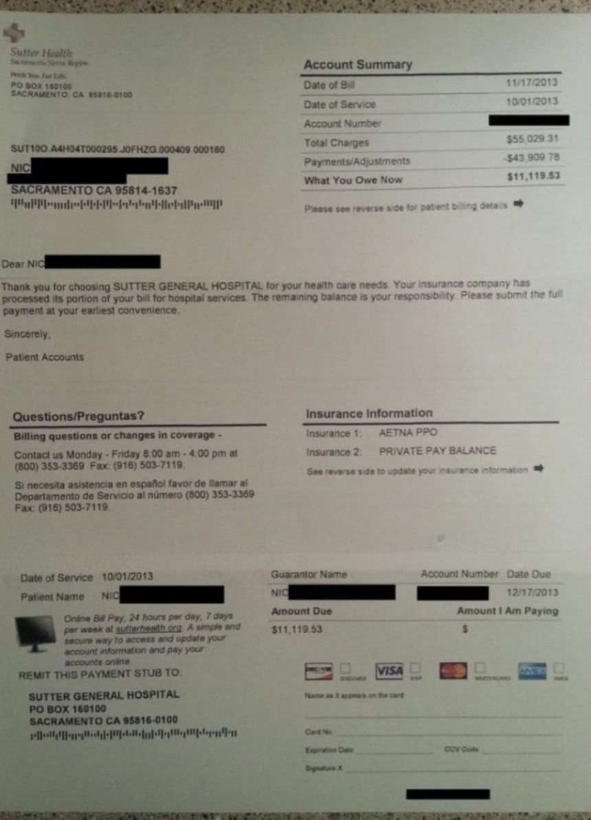 トータルの金額が書いてあるが、55,029.31ドル(約575万円)だ。幸い保険に入っていたのでその80%はカバーできたそうだが、それでも残り11,119.53ドル(約116万円)を払はなくてはならない。