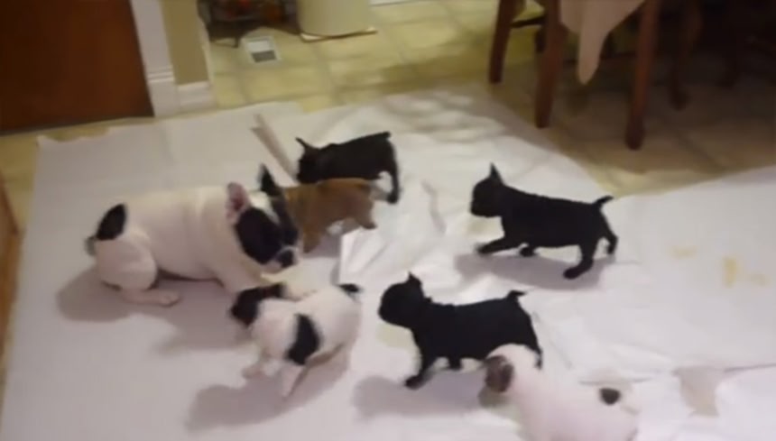 フレンチブルドッグのお父さんが、生後6週間の子どもたちのお世話をしているほのぼの動画。全部の子どもたちを気遣いながらも、男らしく荒ぶった遊びも取り入れるという、なかなかのイクメンぷりを発揮している。
