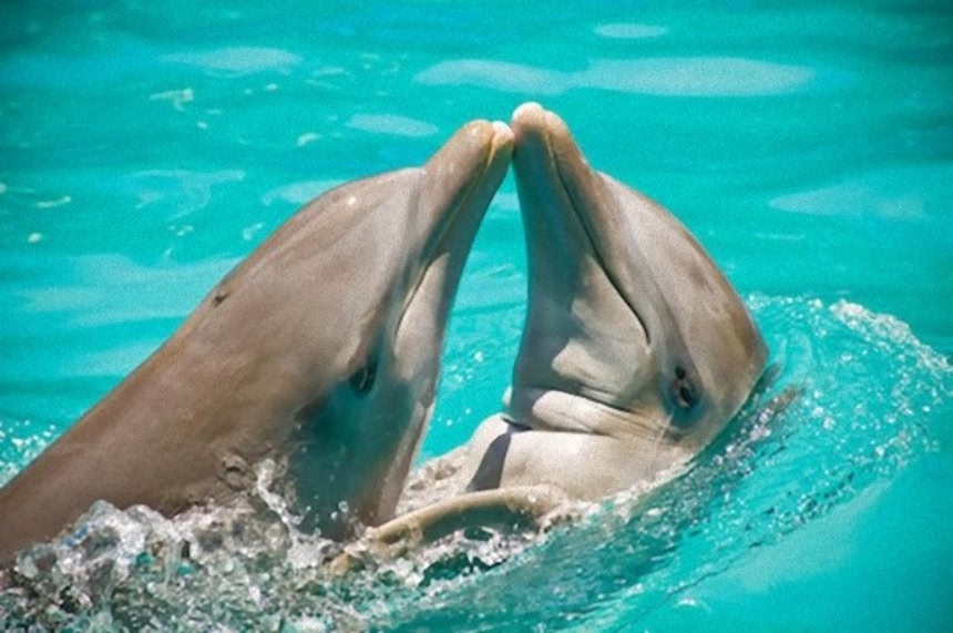 この画像を大きなサイズで見るこのバンドウイルカの愛らしいシーンは、ドミニカ共和国のマナティパークで撮られたもの。このイルカは世界中の水族館にいるが、野生のものは熱帯か温帯の水域でしか見られない。人間と同じようにイルカは社交的で、スキンシップをすると言われていて、胸びれを使って互いに撫であって、友情を示すという。