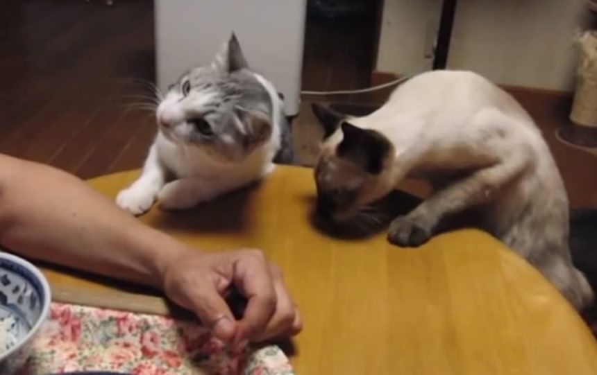 この術にかかると、飼い主はどうしても猫に食べ物を与えずにはいられなくなってしまうという、眼力で飼い主を操る猫の特殊能力発動映像。