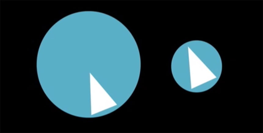 映像の最初に2つの青い円がでてくる。右側にある円の方が左側よりおおきく見える。しかしこれは錯覚である。周囲に対象より大きいものを置くと小さく見える錯覚である。青い円の周りの模様を取り除くと、2つの円が同じ大きさだということがわかるだろう。