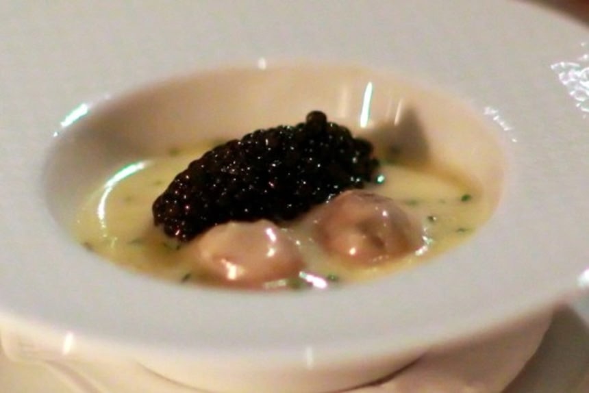 レストランの建物は1900年初期に建てられたもので、国の指定する歴史登録財に指定されている。オイスターとキャビアのお口取りはオイスターとチョウザメキャビアのサバイヨンソースじたて。ソースにはタピオカが入っている。