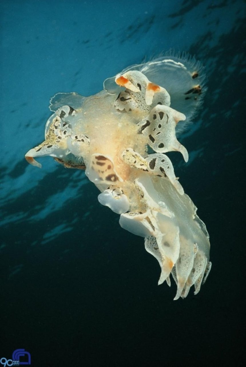 どうやら、「テテュス・フィンブリア(Tethys Fimbria)」と言うメリベウミウシ属の仲間らしい。地中海東部から大西洋の海岸に生息する生き物で、大きなフードのような口で獲物を捕らえる。数種類あるらしいが、体の両側に背側突起が並んでいるのが特徴。この突起は平たく、根元にふたつの小さなえらがついている。