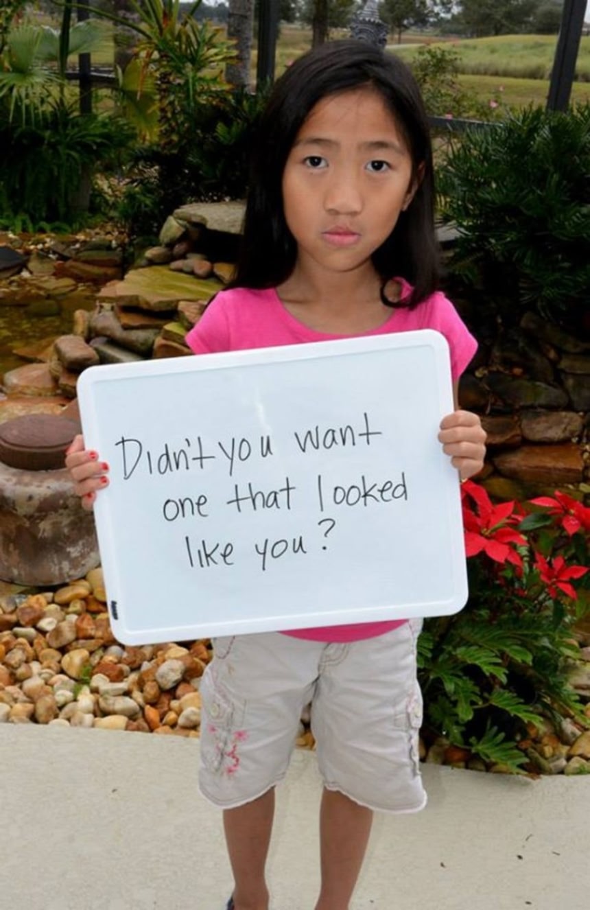わざわざ肌の色の違う養子をとって、こんなボードを持たせるなんて残酷なことをする意味がよくわからない。