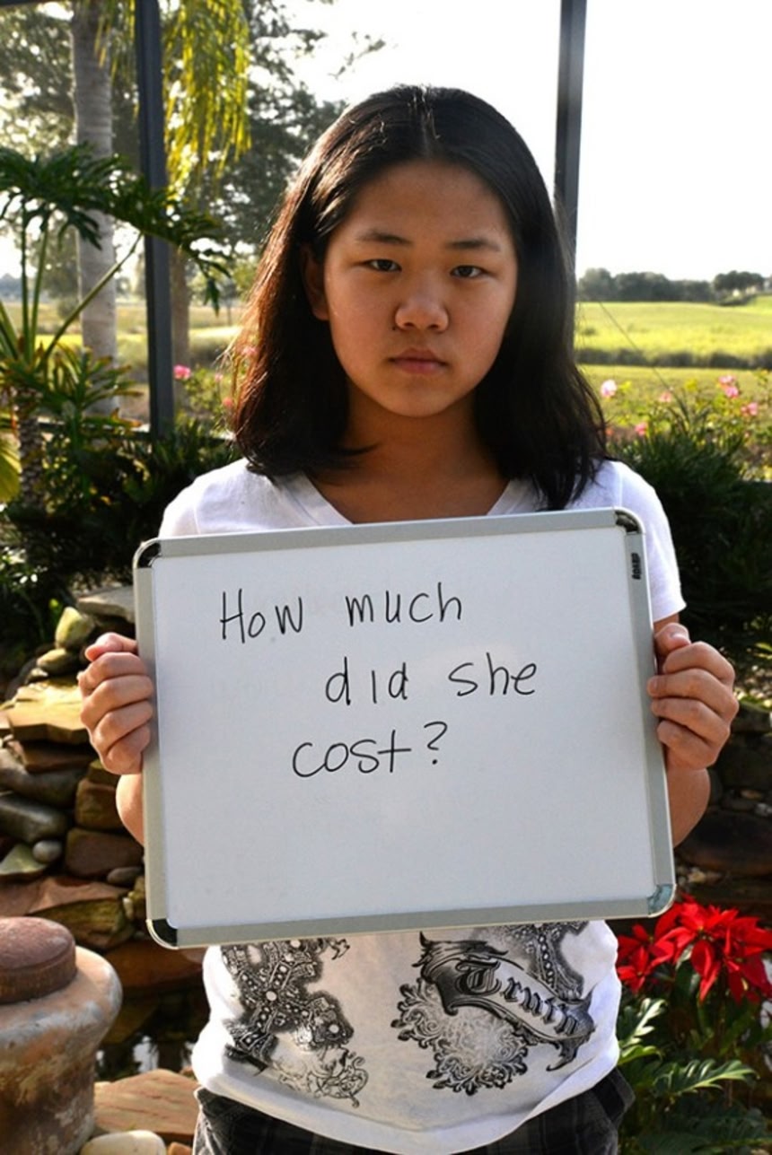 この画像を大きなサイズで見る米バージニア州に住むフォトグラファーの白人女性、キム・ケリー・ワグナーさんは、子供に恵まれなかったため、中国から2人の娘を養子にした。それからというもの、人々は2人の娘に対して、またワグナーさんに対して、心無い言葉をかけるようになった。そうした言葉が、いかにバカげたことで人を傷つけるのかをわかってもらおうと、ワグナーさんは、娘たちが言われた無神経な言葉をホワイトボードに書き、それを掲げて写真を撮った。