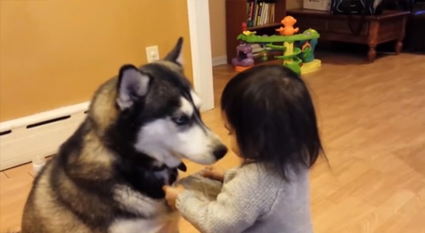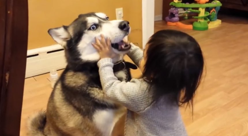 幼女がハスキーに噛みつくのか
