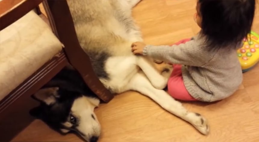 ハスキーは面倒臭がってるけど相手が子供だから我慢して飽きれてる