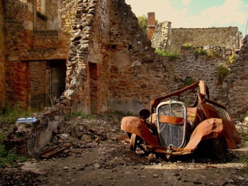この画像を大きなサイズで見る第二次大戦中、ナチスによって大規模虐殺が行われ、廃墟になった村。町全体が燃やされ、住人のほとんどが殺された。ナチスの蛮行を忘れないため、村は今でも当時のままの姿で残されている。