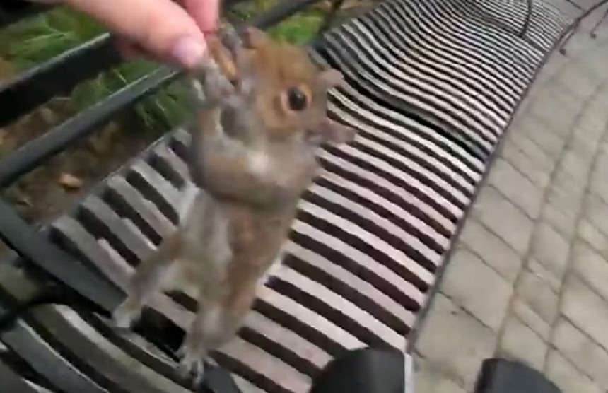 米ニューヨーク州マンハッタン島南端にあるバッテリー・パークに自転車でサイクリングをしていた男性。野生のリスに持参したピーナッツを 分けてあげた。とてもひとなつっこいリスで、男性の手から直接餌をもらい、目の前でその餌を食べ始めたまではよかったのだが、リスには餌を全部食べず、どこかに備蓄する習性がある。