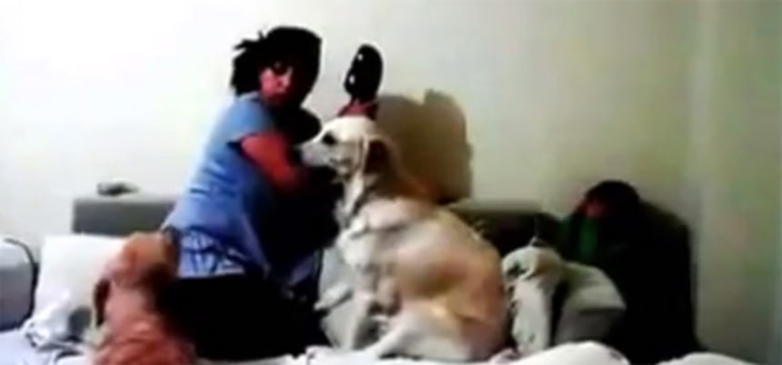 ちなみにこの映像は、犬たちがいかに少女を保護するかを記録する為に撮影されたもので、実際に母親は少女を本気で殴っているわけではない。この2匹の犬は少女を守るようしつけられており、その教えを守り、例え家族である母親でも、身を挺して少女を守っているのだ。