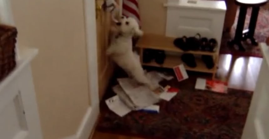 アメリカのとあるファミリーの日常。飼い犬であるカルビンはほぼ毎日のように訪ねてくる郵便局員と全力で戦っているという。郵便局員らしき物音を察知したらドアの前で待機。ドアから郵便物が投函されようものならご覧のとおり・・・