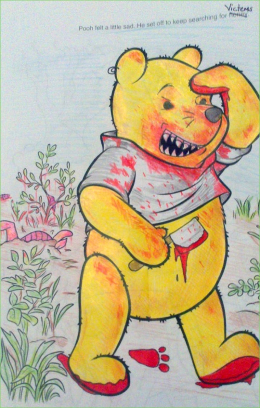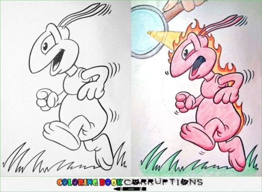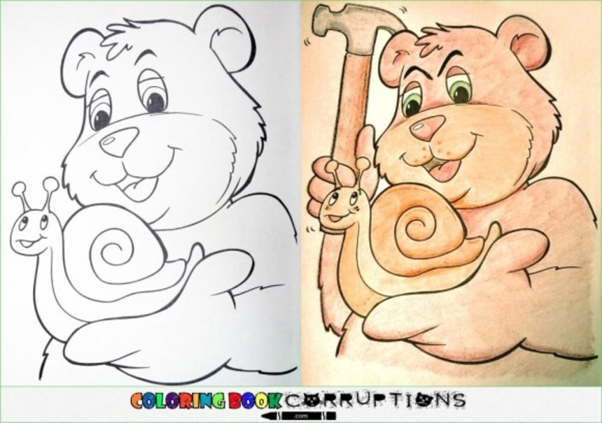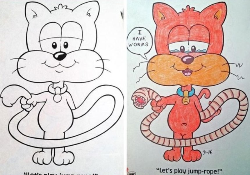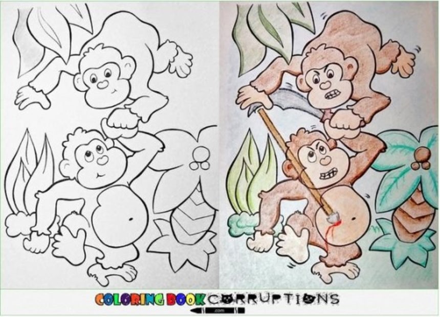 この画像を大きなサイズで見る子ども用のぬり絵本は、明るい絵柄で夢と希望がたっぷりつまってて、どんな色を塗ろうかしらと創造力を掻き立ててくれるものだ。だがしかし、それが邪悪な大人の手に渡ると、いらんストーリーが付け加えられてしまい、世にも悲惨なものへと変貌する。