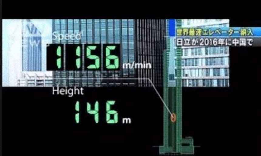 この画像を大きなサイズで見る日本の「日立製作所」は、世界最速となる時速72キロメートルのエレベーターを開発したと発表した。1階から95階まで43秒で着くという。