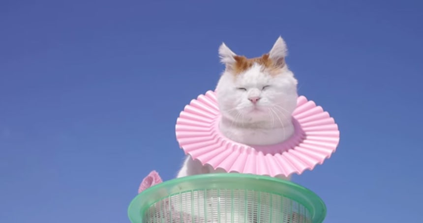 スコーンと晴れた青い空の下、ピンク色のシャンプーハットを日よけ代わりに被る猫。おなじみかご猫さん家のしろさんだ。これまで、こんなにシャンプーハットの似合う猫はいただろうか?否。