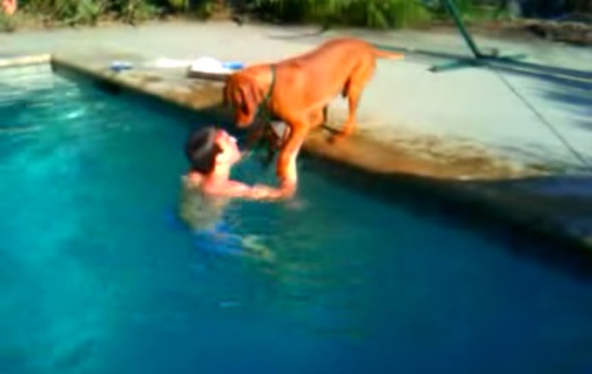 ビズラという犬種の2匹の犬。飼い主がプールに潜ったところ「あらやだ溺れちゃったんじゃないかしら?」と心配しまくる。1匹の方はわりとそうでもないんだけれど、もう1匹、タッカーさんの心配性はかなりのもの、心細い声で鳴き、あたふたしはじめ最後には・・・