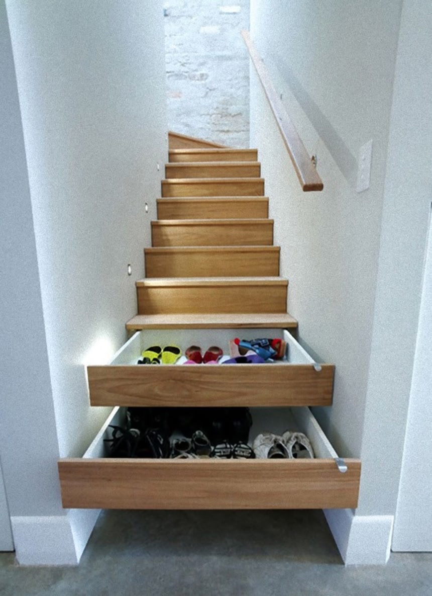 階段の物入れは止めた方がいい。普通の箪笥ですら長い間に寸法や建て付けにゆがみが出て開かなくなることがあるのに、まして荷重のかかる階段では尚更だよ。