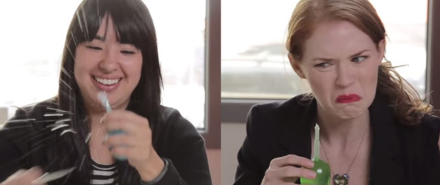 この画像を大きなサイズで見るアメリカ人の反応:食べ方がわからなかったようで皆苦戦していた。味はまるでテレビゲームにでてくるフルーツといった感じ。