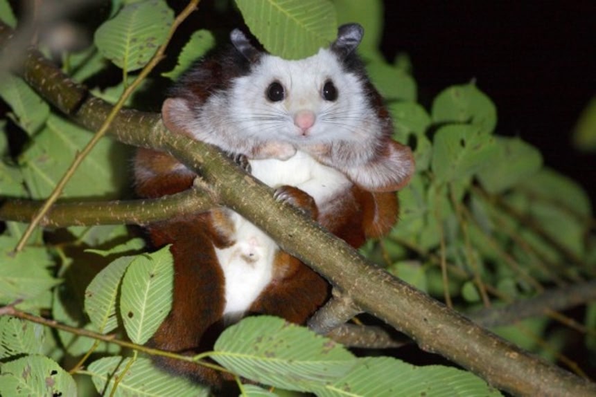 顔から胸、前足部分は白く、胴体は赤茶色、そして目は青色の個体もいるという、中国と台湾の森林に生息するカオジロムササビ(Petaurista alborufus)は、頭胴長が50㎝前後、尾長が45㎝前後とわりと大き目だ。