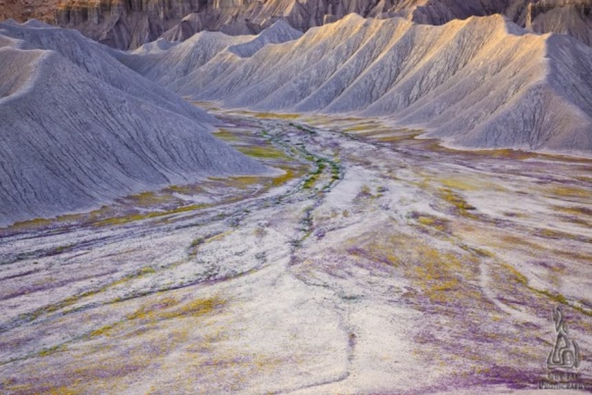岩と土しかない乾燥した悪地の地表を埋め尽くすように咲いている紫色と黄色の花。SF作品に出てくる地球外惑星のような光景をかもしだしているのは、米ユタ州の国立公園内の砂漠地帯である。