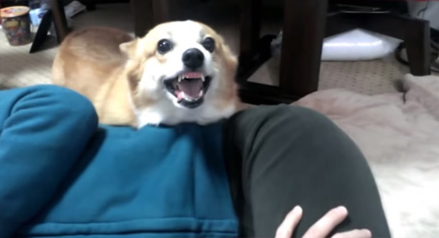 コーギーちゃん完全に耳を後ろに倒してる(服従・恐怖心などを表す)し、口元の感じもややびびってるっぽい。